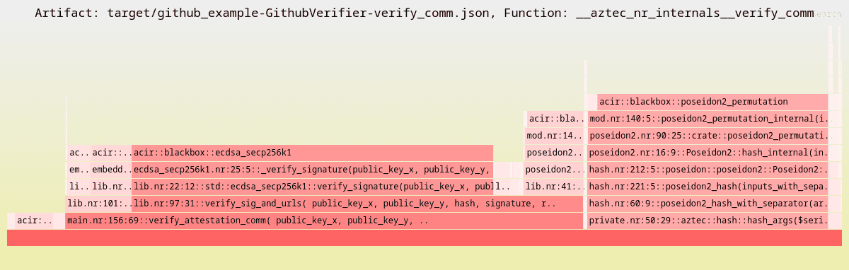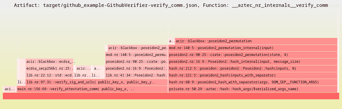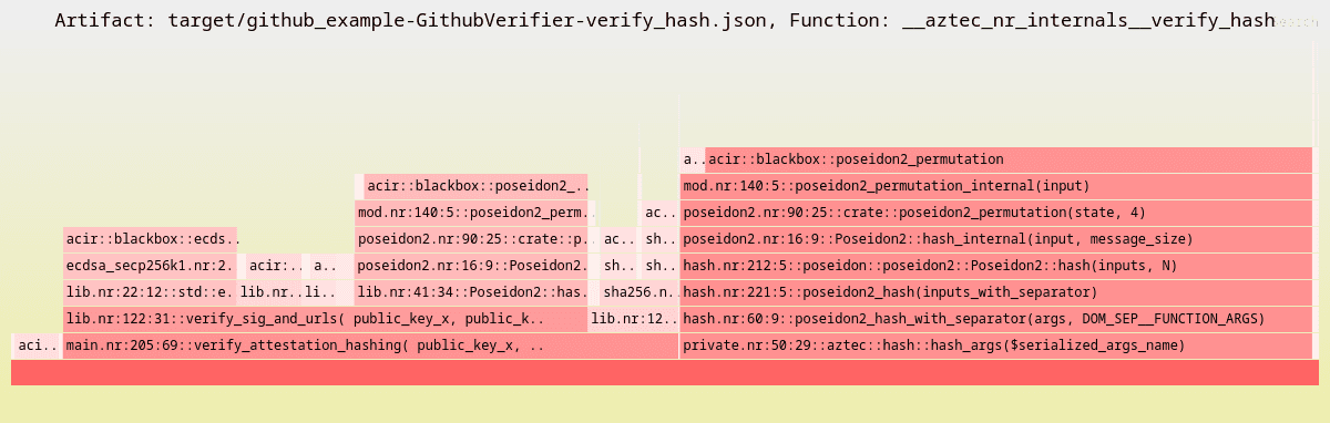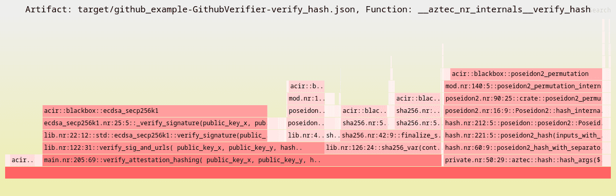 To get more insights into where the gate cost go for private functions, Aztec has the option to generate flamegraphs. The flamegraphs for the 4 example verification functions can be found here. The images below don't show all the details but we can see the two parts that make up for the majority of the gates: the verification of the attestation and something that is called hash_args. The latter is the cost for calling a public function at the end of a private function, which we do to verify the allowed URL (and in the case of commitment-based attestation also point H) against the public value in contract storage.